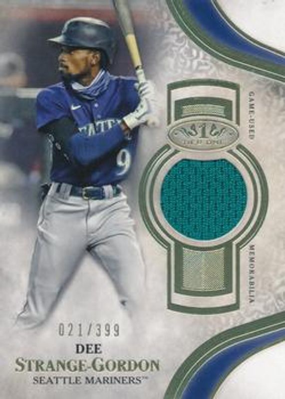 The Dee Gordon 2021 Topps Tier One #T1R-DG Relics /299 card is 1 of 5 Dee Gordon's card variations in the 2021 Topps Tier One set being tracked by Sports Card Investor, including Relics Dual Patch /25, Bat Knobs /1, Limited Lumber /1, and Relics Triple Patch /1.