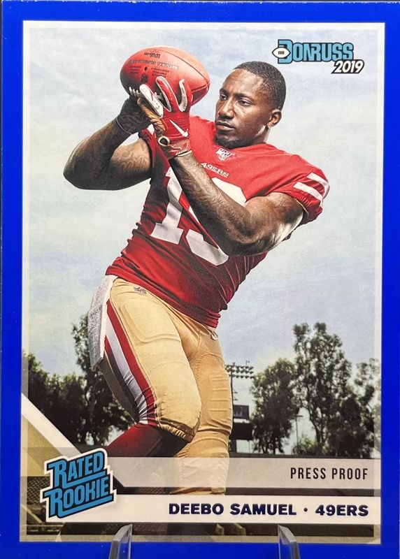 The Deebo Samuel 2019 Donruss #317 Press Proof Blue Rookie card in Raw condition has not changed in price in the last 30 days and was last sold for $3.99 .