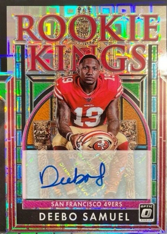 The Deebo Samuel 2019 Optic #RKA15 Rookie Kings Autographs - Black Pandora /10 card in Raw condition has not changed in price in the last 30 days and was last sold for $295.00 .