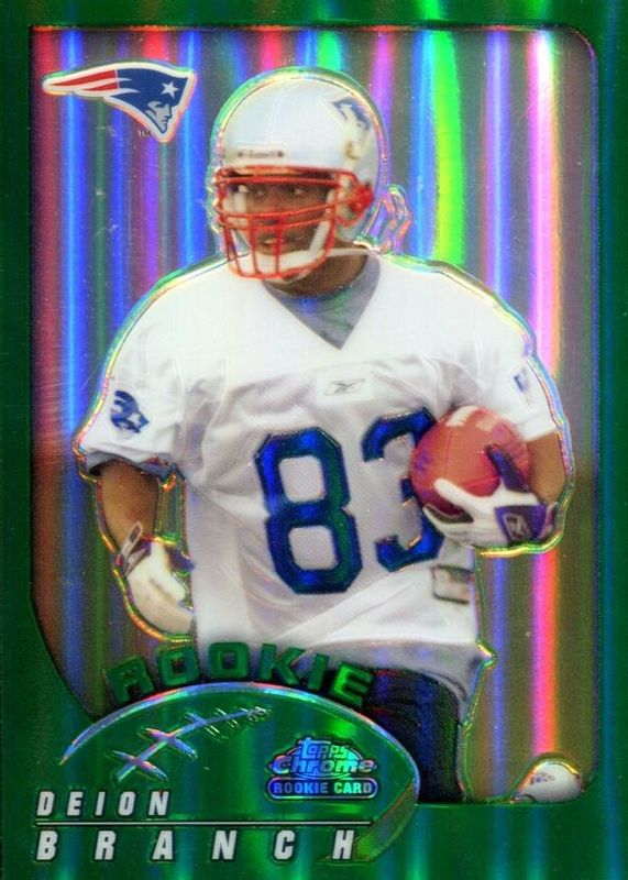 This card is 1 of 2 Deion Branch's card variations in the 2002 Topps Chrome set being tracked by Sports Card Investor, including Black Refractor (Rookie) /100.