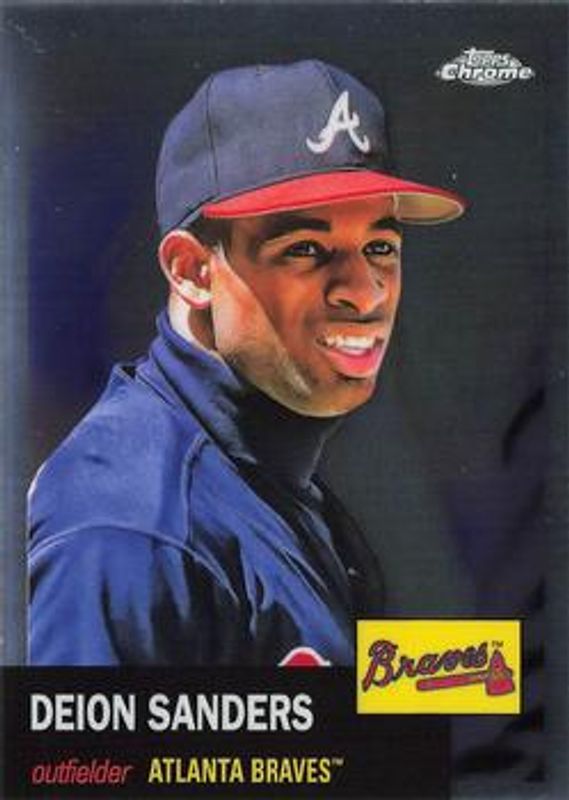 The Deion Sanders 2022 Topps Chrome Platinum Anniversary #217 Base card is 1 of 34 Deion Sanders' card variations in the 2022 Topps Chrome Platinum Anniversary set being tracked by Sports Card Investor, including Black & White Mini Diamond Refractor, Blue Prism Refractor, Gold Prism Refractor, Prism Refractor, and Red Prism Refractor.