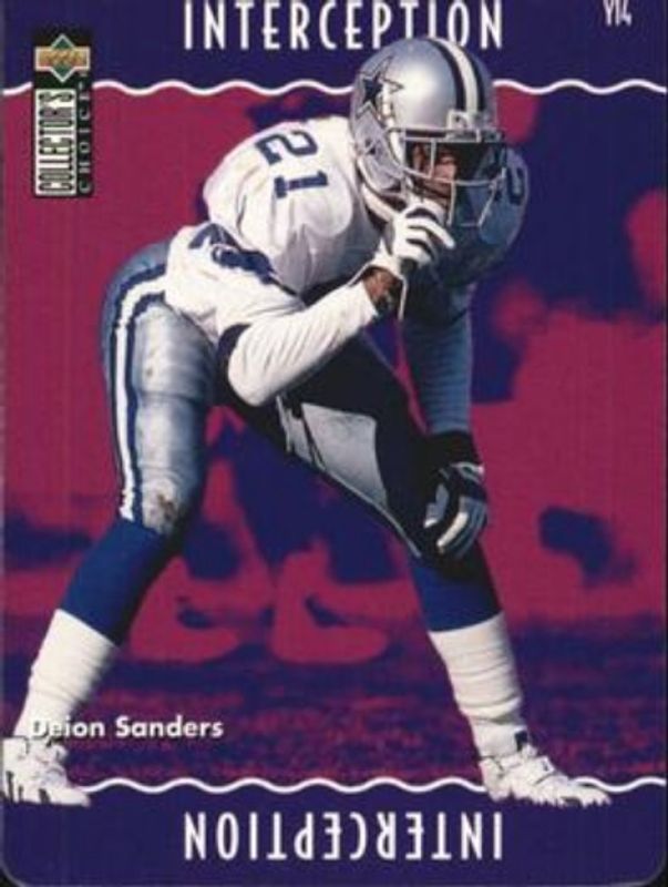 The Deion Sanders 1996 Upper Deck Collector's Choice Update #Y14 You Make The Play card is 1 of 4 Deion Sanders' card variations in the 1996 Upper Deck Collector's Choice Update set being tracked by Sports Card Investor, including Play Action Stick Ums, Play Action Stick Ums Mystery Bases, and You Make The Play.
