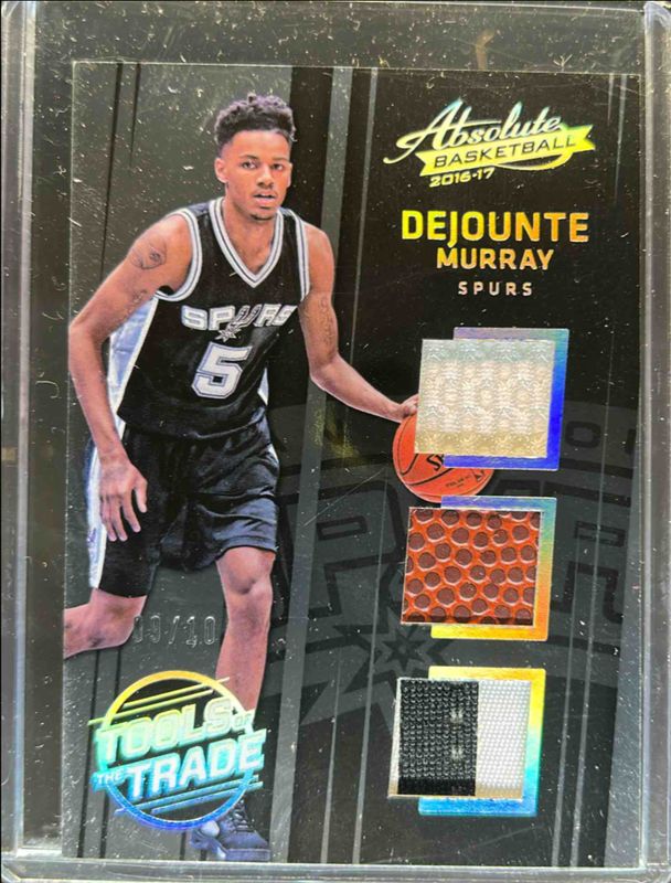 The Dejounte Murray 2016 Absolute #28 Tools of the Trade Rookie Materials Triple Relic Patch /10 card is 1 of 32 Dejounte Murray's card variations in the 2016 Absolute set being tracked by Sports Card Investor, including Base /999, Spectrum Gold /10, Spectrum Black /1, Tools of the Trade Jumbo Rookie - Materials /149, and Tools of the Trade Rookie Materials Dual Relic /149.