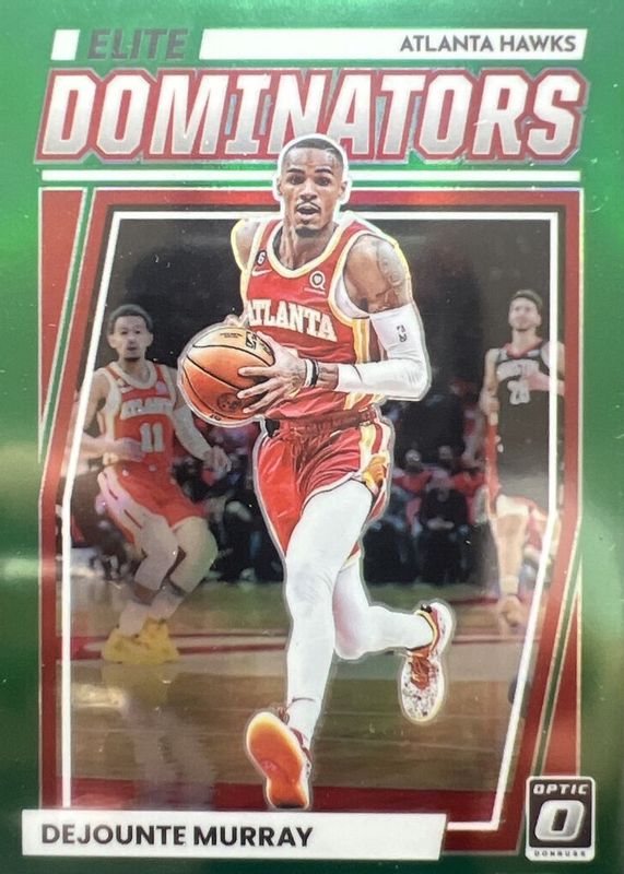 The Dejounte Murray 2022 Optic #12 Elite Dominators - Green /5 card in Raw condition has not changed in price in the last 30 days and was last sold for $6.00 .