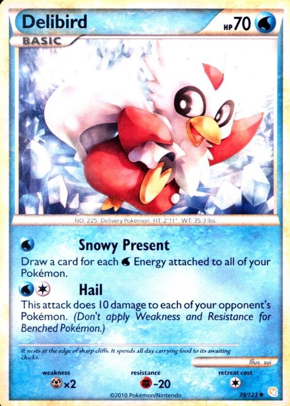 The Delibird 2010 HeartGold & SoulSilver #039/123 Base card in Raw TCG (Lightly Played) condition has moved up $1.26 (+94.0%) in the last 30 days and was last sold for $2.60 .
