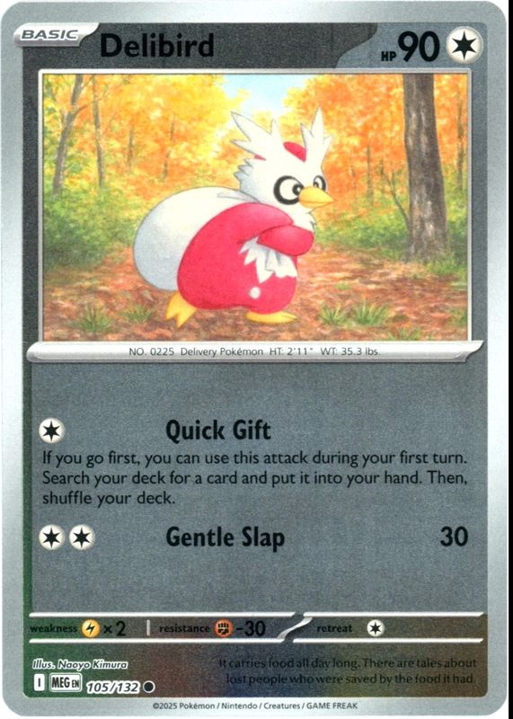 The Delibird 2025 Mega Evolution #105/132 Reverse Holo card in Raw TCG (Near Mint) condition has moved down -$0.24 (-16.1%) in the last 30 days and was last sold for $1.25 .