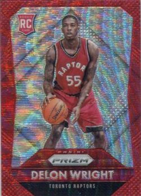 The Delon Wright 2015 Prizm #310 Ruby Wave /350 Rookie card is 1 of 21 Delon Wright's card variations in the 2015 Prizm set being tracked by Sports Card Investor, including Base, Flash, Green, Orange Wave, and Red White Blue.