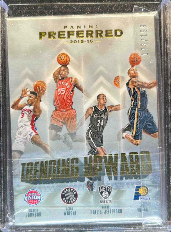 The Delon Wright / Joe Young / Rondae Hollis-Jefferson / Stanley Johnson 2015 Preferred #TU-PAC Trending Upward Book /199 card is 1 of 3 Delon Wright / Joe Young / Rondae Hollis-Jefferson / Stanley Johnson's card variations in the 2015 Preferred set being tracked by Sports Card Investor, including Trending Upward Book - Prime, and Trending Upward Book - Super Prime /1.