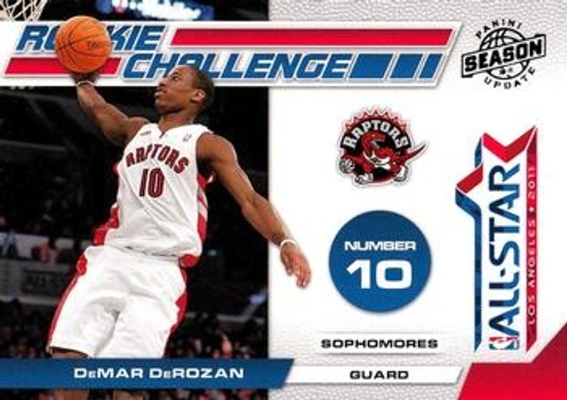 The DeMar DeRozan 2010 Season Update #10 Rookie Challenge card is 1 of 11 DeMar DeRozan's card variations in the 2010 Season Update set being tracked by Sports Card Investor, including Base, Silver /99, Gold /24, Platinum /1, and Rookie Challenge - Materials /799.