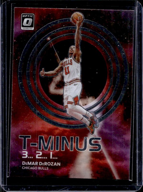 The DeMar DeRozan 2022 Optic #1 T-Minus 3...2...1... card is 1 of 78 DeMar DeRozan's card variations in the 2022 Optic set being tracked by Sports Card Investor, including Base, Checkerboard, Choice Red & Green, Fast Break, and Green Shock.