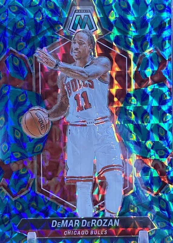 The DeMar DeRozan 2023 Mosaic #82 Choice Peacock /(SSP) card in Raw condition has not changed in price in the last 30 days and was last sold for $18.39 .
