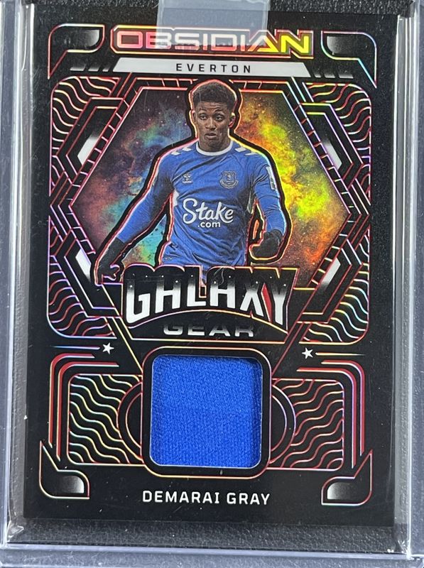 The Demarai Gray 2022 Obsidian #GG-DGR Galaxy Gear Relics Electric Etch - Red /25 card is 1 of 16 Demarai Gray's card variations in the 2022 Obsidian set being tracked by Sports Card Investor, including Galaxy Gear Relics /199, Volcanic Signatures /199, Galaxy Gear Relics - Electric Etch Orange /75, Volcanic Signatures - Electric Etch Orange /75, and Galaxy Gear Relics - Electric Etch Purple /50.