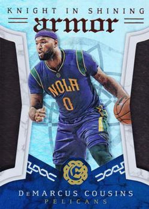 The DeMarcus Cousins 2016 Excalibur #9 Knight in Shining Armor card is 1 of 38 DeMarcus Cousins' card variations in the 2016 Excalibur set being tracked by Sports Card Investor, including Base, Baron, Count, Lord, and Viscount.