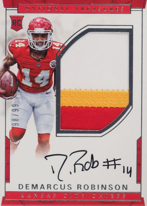 This card is 1 of 11 Demarcus Robinson's card variations in the 2016 National Treasures set being tracked by Sports Card Investor, including Rookie Patch Auto - Numbers Green (/14), Rookie Patch Auto - Holo Silver /25, Rookie Patch Auto - 10th Anniversary /10, Rookie Patch Auto - 10th Anniversary Platinum /10, and Rookie Patch Auto - Gold /10.