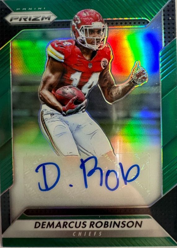 The Demarcus Robinson 2016 Prizm #RA-DRB Rookie Autographs - Green card in Raw condition has not changed in price in the last 30 days and was last sold for $3.00 .