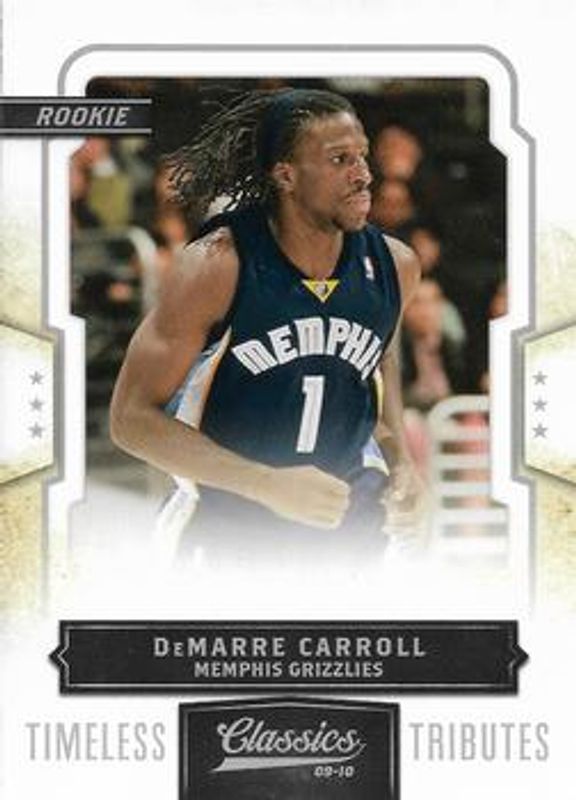 The DeMarre Carroll 2009 Classics #184 Timeless Tributes Silver /100 Rookie card is 1 of 6 DeMarre Carroll's card variations in the 2009 Classics set being tracked by Sports Card Investor, including Base /999, Timeless Tributes Gold /50, Timeless Tributes Platinum /25, Timeless Threads /199, and Timeless Threads - Prime /25.