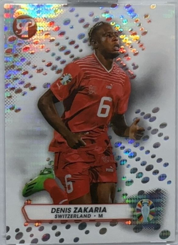 The Denis Zakaria 2024 Topps Pristine Road to UEFA Euro #185 Pristine Refractor card is 1 of 21 Denis Zakaria's card variations in the 2024 Topps Pristine Road to UEFA Euro set being tracked by Sports Card Investor, including Base, Refractor, Green Refractor /125, Purple Refractor /99, and Blue Pristine Refractor /75.