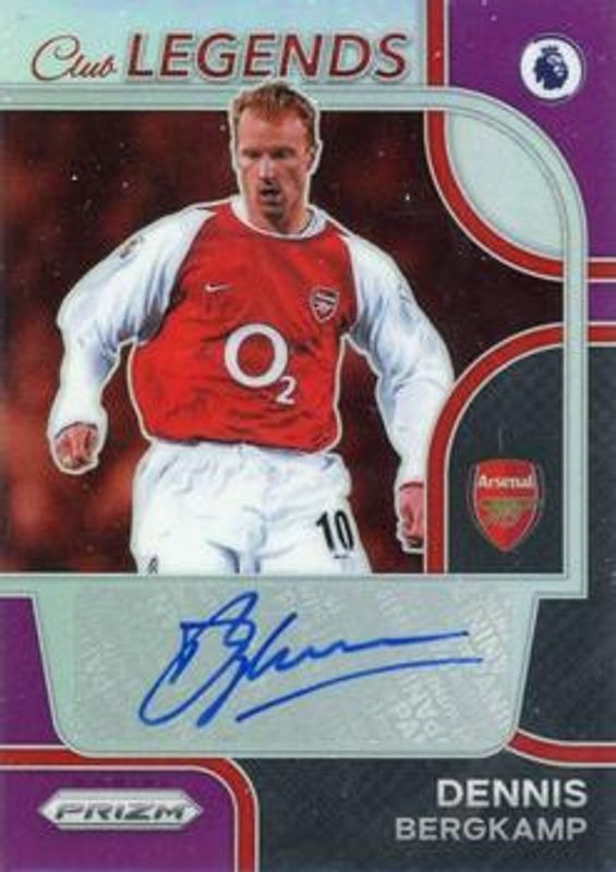 The Dennis Bergkamp 2022 Prizm Premier League #CL-DB Club Legends Signatures - Purple /25 card is 1 of 15 Dennis Bergkamp's card variations in the 2022 Prizm Premier League set being tracked by Sports Card Investor, including Club Legends Signatures, Club Legends Signatures - Blue Shimmer, Club Legends Signatures - Breakaway, Club Legends Signatures - Choice, and Club Legends Signatures - Green Pulsar.