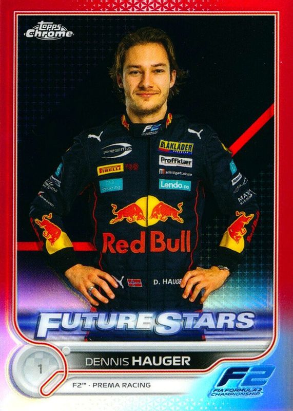The Dennis Hauger 2022 Topps Chrome Formula 1 #77 Red Refractor /5 card in Raw condition has not changed in price in the last 30 days and was last sold for $70.00 .