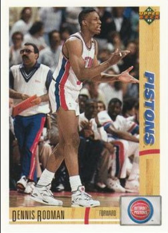 The Dennis Rodman 1991 Upper Deck #185 Base card is 1 of 3 Dennis Rodman's card variations in the 1991 Upper Deck set being tracked by Sports Card Investor, including Base, and Award Winner Holograms.