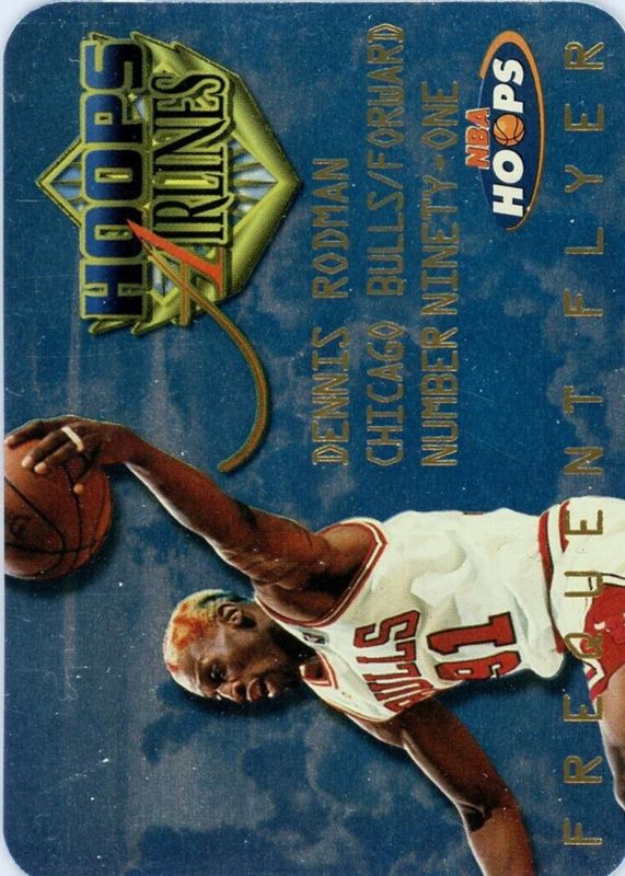 The Dennis Rodman 1997 Hoops #5 Frequent Flyer Club card in Raw condition has not changed in price in the last 30 days and was last sold for $10.50 .