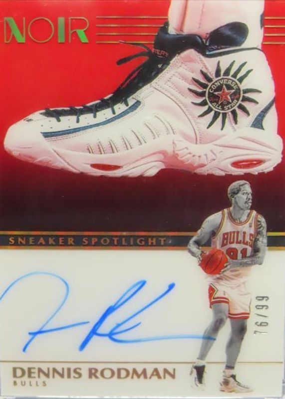 The Dennis Rodman 2019 Noir #SNS-DR Sneaker Spotlight Autographs /99 card in Raw condition has not changed in price in the last 30 days and was last sold for $770.00 .