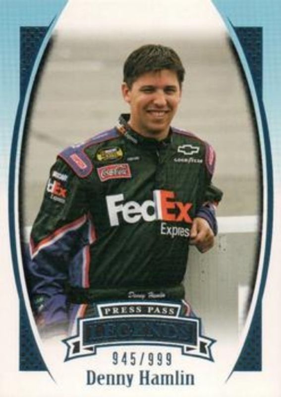 The Denny Hamlin 2007 Press Pass Legends #B-50 Blue /999 card is 1 of 24 Denny Hamlin's card variations in the 2007 Press Pass Legends set being tracked by Sports Card Investor, including Base, Solo, Bronze /599, Gold /249, and Holofoil /99.