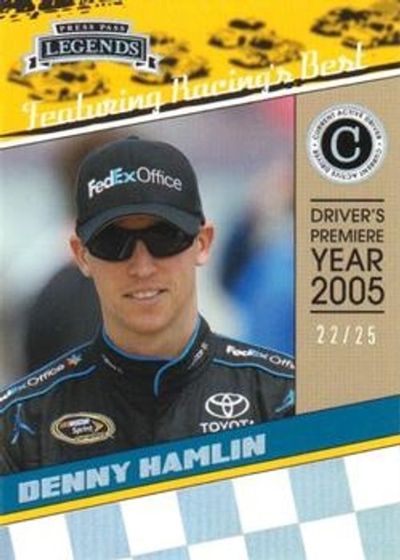 The Denny Hamlin 2011 Press Pass Legends #43 Holofoil /25 card is 1 of 21 Denny Hamlin's card variations in the 2011 Press Pass Legends set being tracked by Sports Card Investor, including Base, Gold /250, Red /99, Purple /25, and Press Plates Black /1.