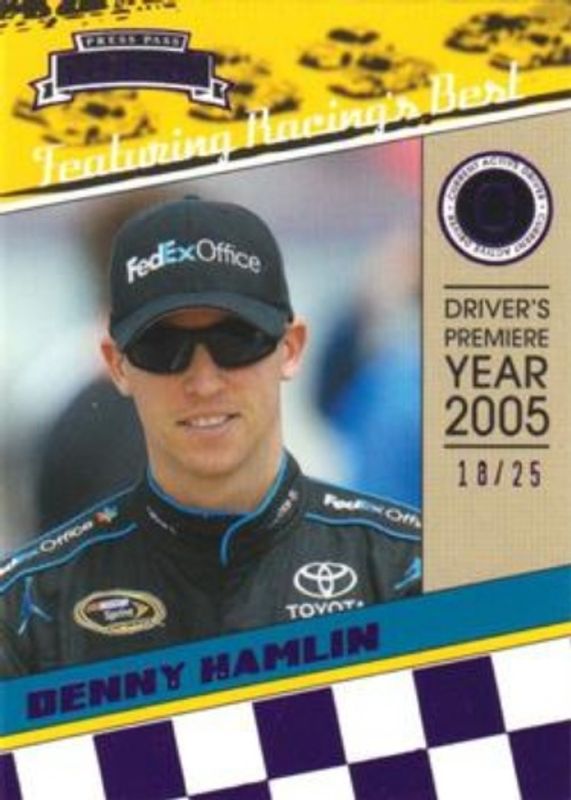 The Denny Hamlin 2011 Press Pass Legends #43 Purple /25 card is 1 of 21 Denny Hamlin's card variations in the 2011 Press Pass Legends set being tracked by Sports Card Investor, including Base, Gold /250, Red /99, Holofoil /25, and Press Plates Black /1.