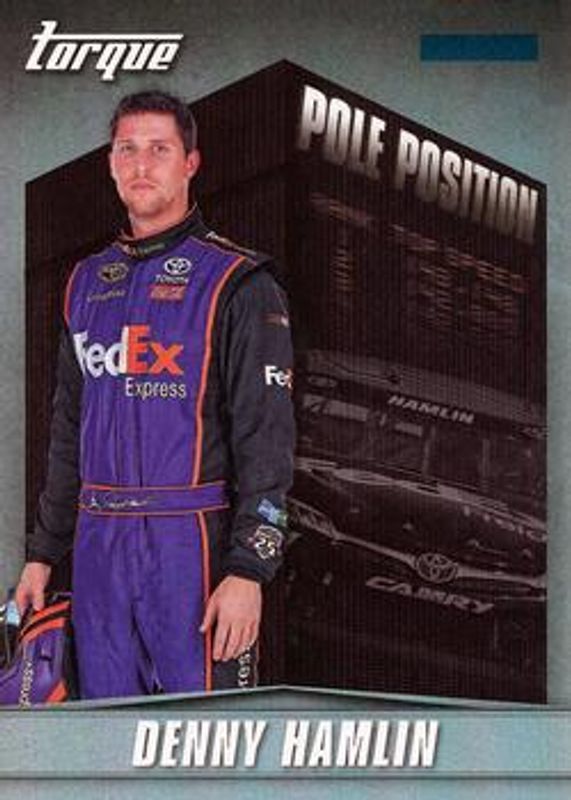 The Denny Hamlin 2016 Torque NASCAR #PP6 Pole Position card is 1 of 104 Denny Hamlin's card variations in the 2016 Torque NASCAR set being tracked by Sports Card Investor, including #6 Base, #83 Base, #6 Gold, #83 Gold, and #6 Blue /125.