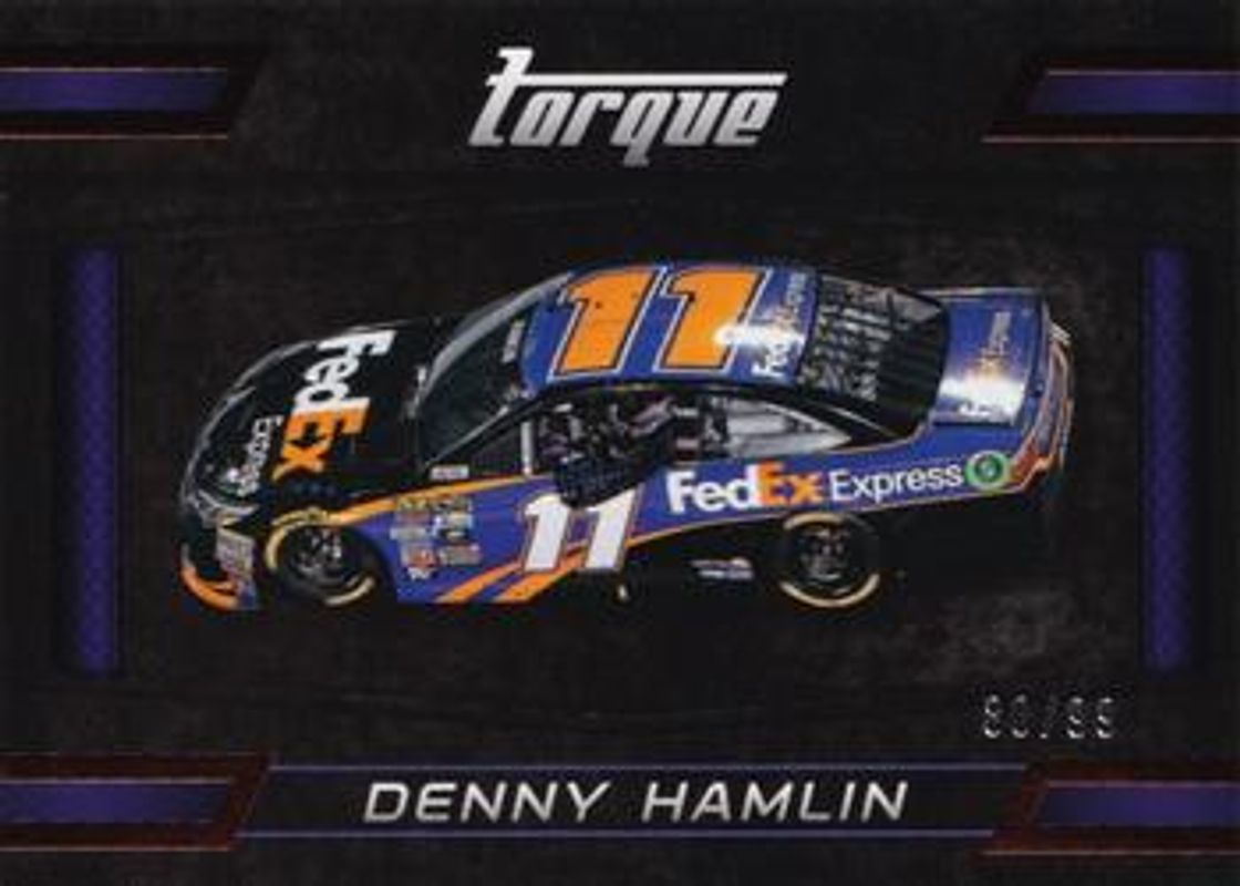 The Denny Hamlin 2016 Torque NASCAR #83 Red /99 card is 1 of 104 Denny Hamlin's card variations in the 2016 Torque NASCAR set being tracked by Sports Card Investor, including #6 Base, #83 Base, #6 Gold, #83 Gold, and #6 Blue /125.