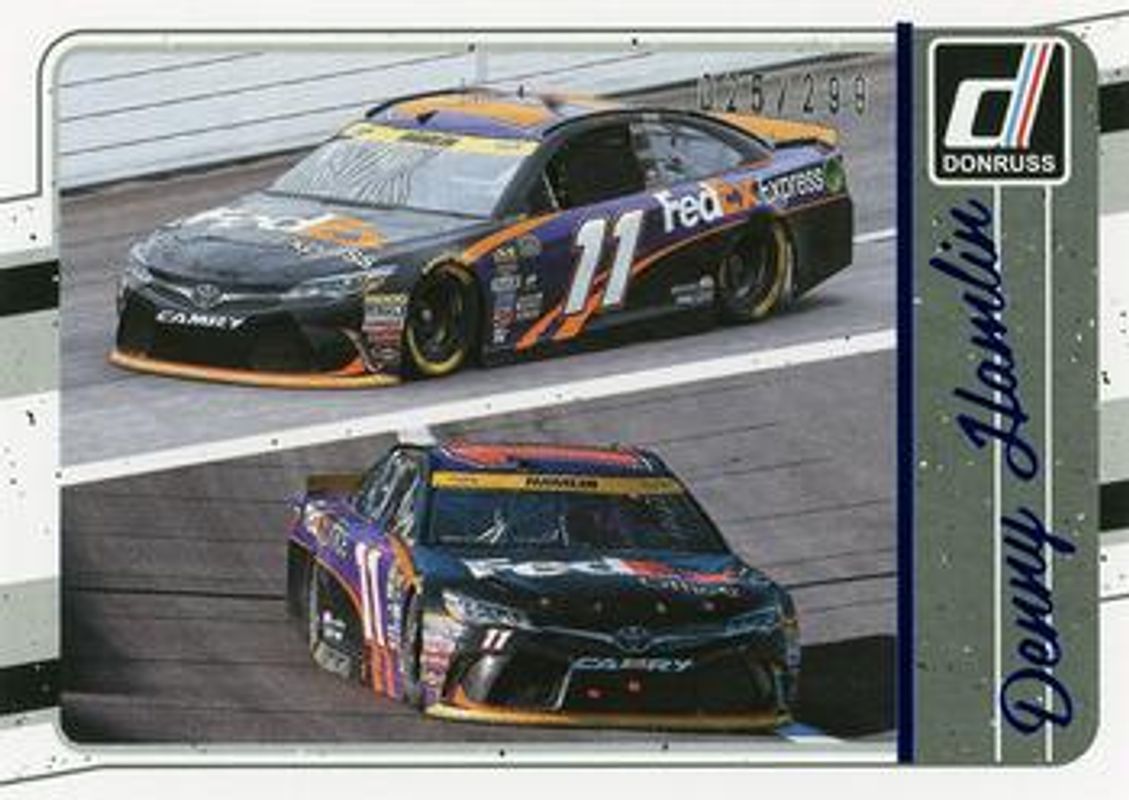 The Denny Hamlin 2017 Donruss NASCAR #112 Blue Foil /299 card is 1 of 72 Denny Hamlin's card variations in the 2017 Donruss NASCAR set being tracked by Sports Card Investor, including #112 Base, #6 Base, #41 Base, #146 Base, and #129 Base.