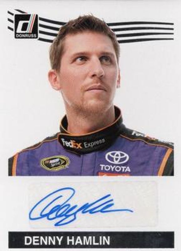 The Denny Hamlin 2017 Donruss NASCAR #DH Retro Signatures 1984 card is 1 of 72 Denny Hamlin's card variations in the 2017 Donruss NASCAR set being tracked by Sports Card Investor, including #112 Base, #6 Base, #41 Base, #146 Base, and #129 Base.