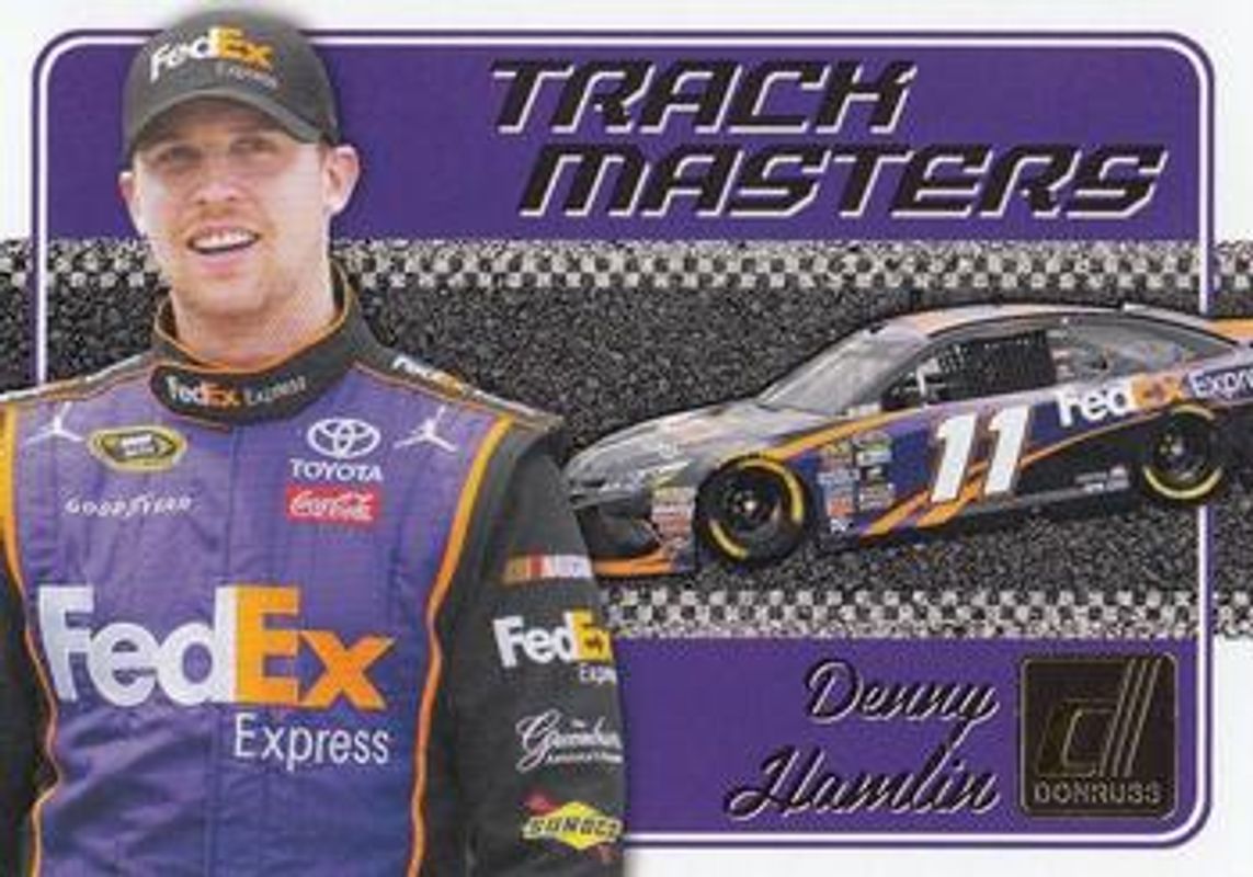The Denny Hamlin 2017 Donruss NASCAR #TM1 Track Masters card is 1 of 72 Denny Hamlin's card variations in the 2017 Donruss NASCAR set being tracked by Sports Card Investor, including #112 Base, #6 Base, #41 Base, #146 Base, and #129 Base.