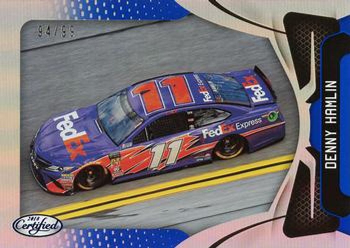 The Denny Hamlin 2018 Certified NASCAR #100 Blue /20 card is 1 of 94 Denny Hamlin's card variations in the 2018 Certified NASCAR set being tracked by Sports Card Investor, including #69 Base /149, #100 Base /149, #69 Orange /249, #100 Orange /249, and #100 Mirror Gold /25.