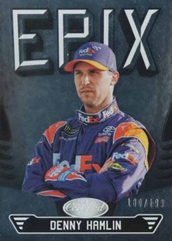 The Denny Hamlin 2018 Certified NASCAR #E5 Epix /199 card is 1 of 94 Denny Hamlin's card variations in the 2018 Certified NASCAR set being tracked by Sports Card Investor, including #69 Base /149, #100 Base /149, #69 Orange /249, #100 Orange /249, and #100 Mirror Gold /25.