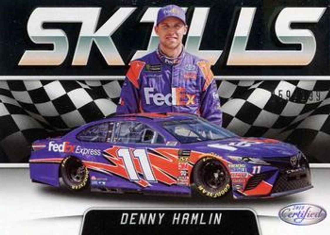 The Denny Hamlin 2018 Certified NASCAR #S6 Skills /199 card is 1 of 94 Denny Hamlin's card variations in the 2018 Certified NASCAR set being tracked by Sports Card Investor, including #69 Base /149, #100 Base /149, #69 Orange /249, #100 Orange /249, and #100 Mirror Gold /25.