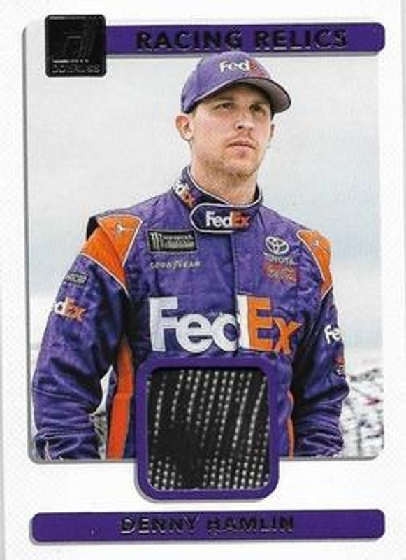 The Denny Hamlin 2018 Donruss NASCAR #RR-DH Racing Relics card is 1 of 60 Denny Hamlin's card variations in the 2018 Donruss NASCAR set being tracked by Sports Card Investor, including #92 Base, #38 Base, #128 Base, #11 Base, and #92 Gold Foil /499.
