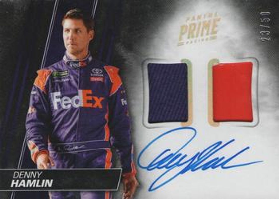 Denny Hamlin 2018 Prime NASCAR #DMA-DH Dual Materials Autographs Holo Gold /10 RAW Price Guide