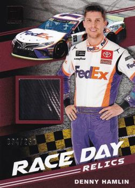 The Denny Hamlin 2020 Donruss NASCAR #RD-DH Race Day Relics Red /250 card is 1 of 121 Denny Hamlin's card variations in the 2020 Donruss NASCAR set being tracked by Sports Card Investor, including #101 Base, #12 Base, #174 Base, #194 Base, and #35 Base.