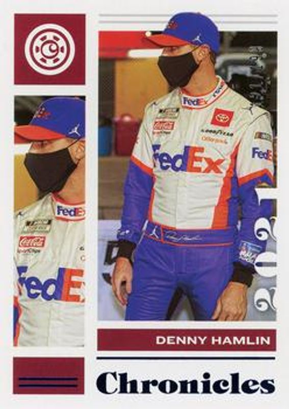 The Denny Hamlin 2021 Chronicles NASCAR #20 Blue /199 card is 1 of 106 Denny Hamlin's card variations in the 2021 Chronicles NASCAR set being tracked by Sports Card Investor, including Base, Red /99, Purple /25, Gold /10, and Black /1.