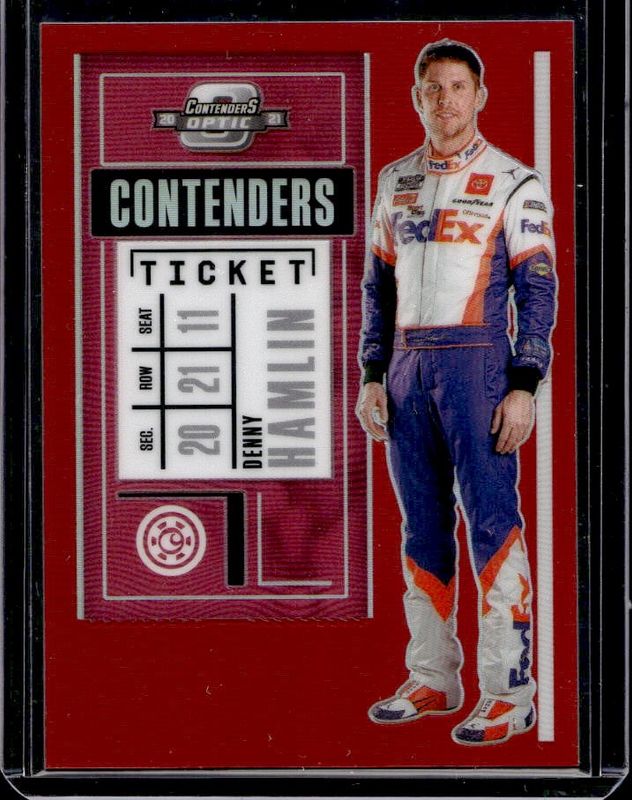 The Denny Hamlin 2021 Chronicles NASCAR #20 Contenders Optic - Red /99 card is 1 of 106 Denny Hamlin's card variations in the 2021 Chronicles NASCAR set being tracked by Sports Card Investor, including Base, Blue /199, Red /99, Purple /25, and Gold /10.