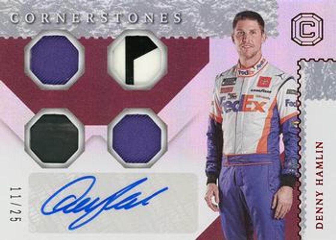 The Denny Hamlin 2021 Chronicles NASCAR #CMS-DH Cornerstones Materials Signatures - Red /25 card is 1 of 106 Denny Hamlin's card variations in the 2021 Chronicles NASCAR set being tracked by Sports Card Investor, including Base, Blue /199, Red /99, Purple /25, and Gold /10.
