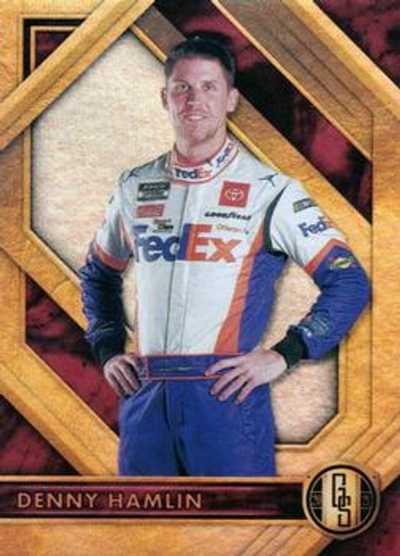 The Denny Hamlin 2021 Chronicles NASCAR #15 Gold Standard card is 1 of 106 Denny Hamlin's card variations in the 2021 Chronicles NASCAR set being tracked by Sports Card Investor, including Base, Blue /199, Red /99, Purple /25, and Gold /10.