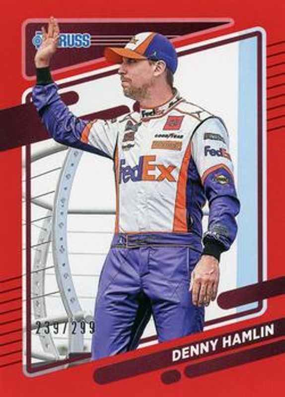 The Denny Hamlin 2022 Donruss NASCAR #68 Red /299 card is 1 of 150 Denny Hamlin's card variations in the 2022 Donruss NASCAR set being tracked by Sports Card Investor, including #44 Base, #68 Base, #21 Base, #146 Base, and #44 Carolina Blue.