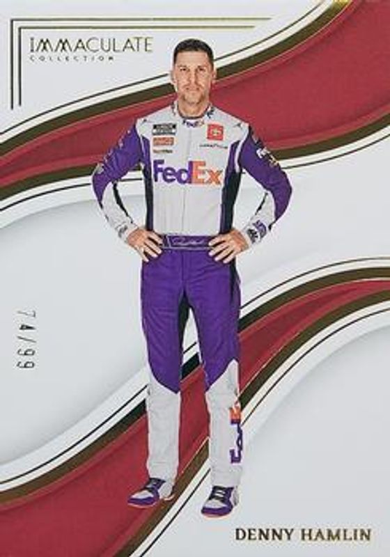 The Denny Hamlin 2023 Chronicles NASCAR #35 Immaculate /99 card is 1 of 145 Denny Hamlin's card variations in the 2023 Chronicles NASCAR set being tracked by Sports Card Investor, including Chronicles Swatches, Classics, Classics Autographs, Clearly Donruss, and Clear Vision.