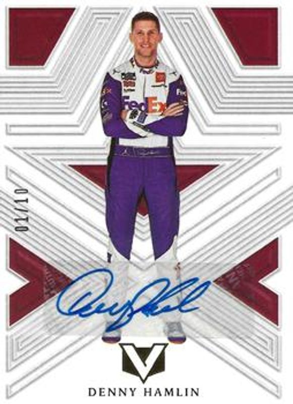 The Denny Hamlin 2023 Chronicles NASCAR #17 Vertex Autographs - Gold /10 card is 1 of 145 Denny Hamlin's card variations in the 2023 Chronicles NASCAR set being tracked by Sports Card Investor, including Chronicles Swatches, Classics, Classics Autographs, Clearly Donruss, and Clear Vision.