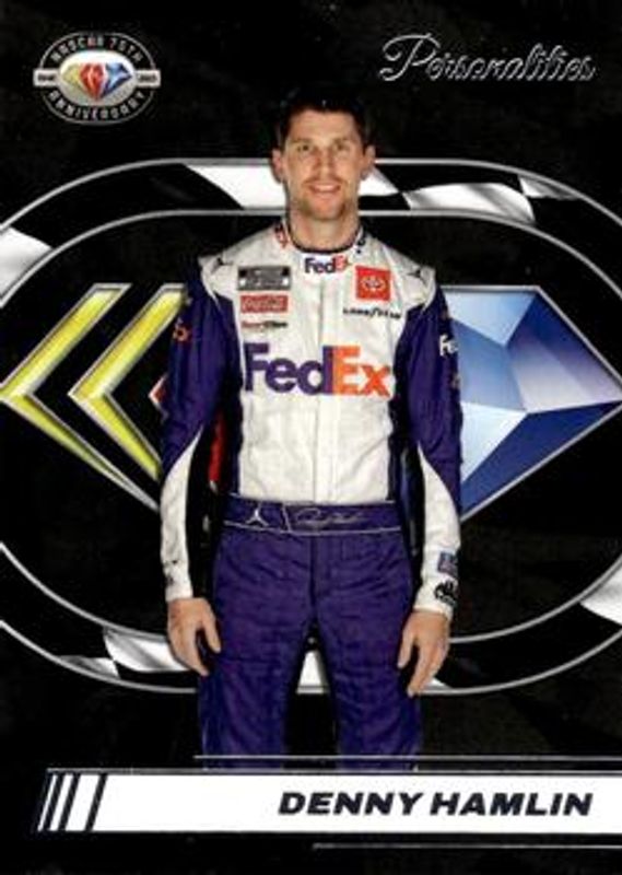 The Denny Hamlin 2023 Donruss NASCAR #9 NASCAR 75th Anniversary card is 1 of 151 Denny Hamlin's card variations in the 2023 Donruss NASCAR set being tracked by Sports Card Investor, including #47 Base, #124 Base, #131 Base, #14 Base, and #124 Carolina Blue.