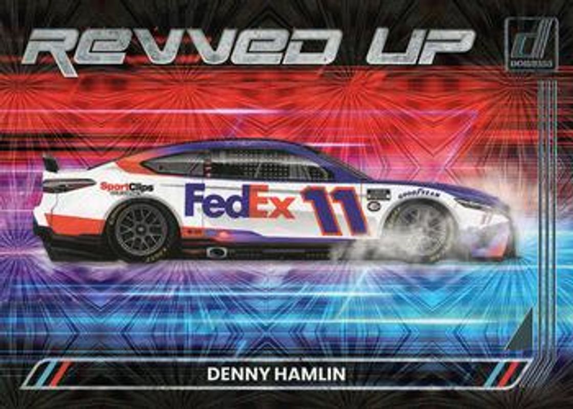 The Denny Hamlin 2023 Donruss NASCAR #RU5 Revved Up card is 1 of 151 Denny Hamlin's card variations in the 2023 Donruss NASCAR set being tracked by Sports Card Investor, including #47 Base, #124 Base, #131 Base, #14 Base, and #124 Carolina Blue.