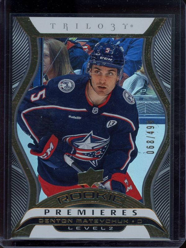 The Denton Mateychuk 2024 Upper Deck Extended Series #T-27 Trilogy Rookie Premiere - Uncommon /499 card is 1 of 43 Denton Mateychuk's card variations in the 2024 Upper Deck Extended Series set being tracked by Sports Card Investor, including Base, Young Guns Base, Clear Cut, Outburst, and Young Guns - Clear Cut.